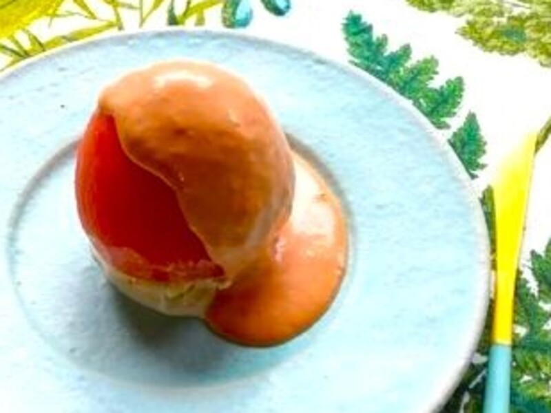 湯むきしたトマトの中にツナサラダを入れ、オーロラソースをかけて仕上げ♪