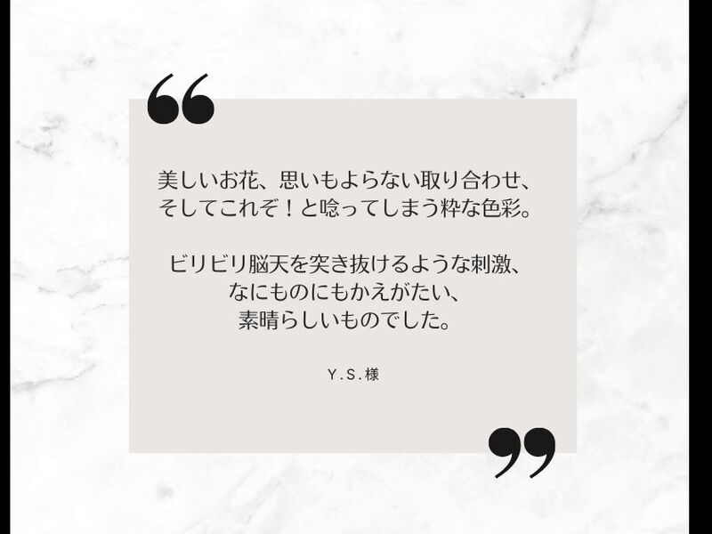 優しく丁寧にパリスタイルのポイントを教えていただき、春のお花が大人かわいく素敵な仕上がりになりました。写真撮影のレッスンもついていて作品により愛着がわきました。和やかな雰囲気で楽しく充実した時間を過ごすことができました。
