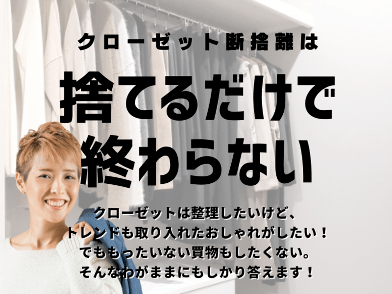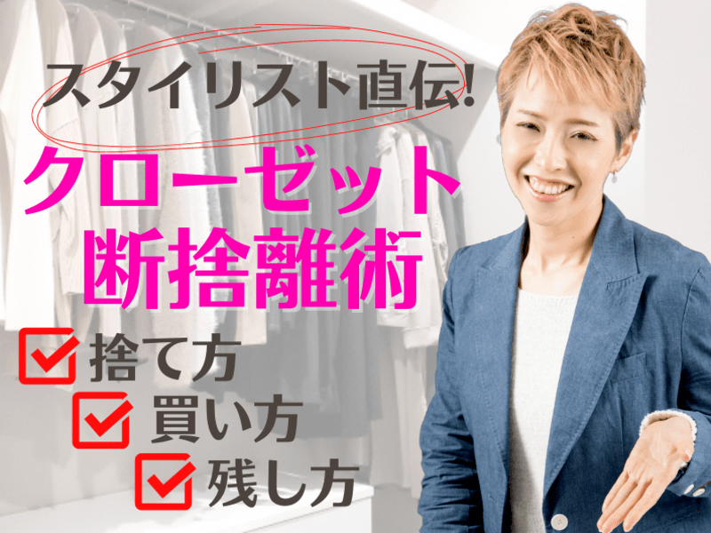 服の断捨離にお困りの方、必見!プラチナバッジ講師が何を残して、どう買い足すかまで伝えます。すっきりクローゼットであなたもオシャレ上手に!