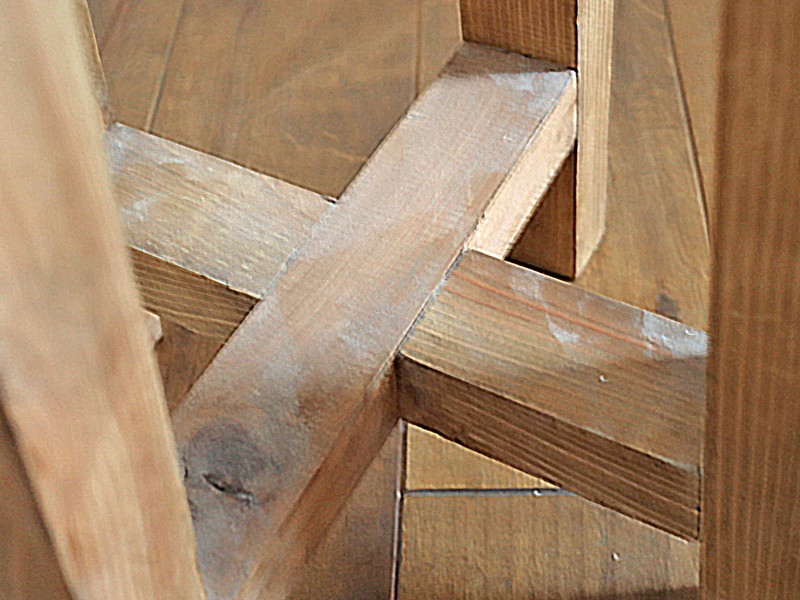 「十字相欠きつぎ」は両方の材料の厚さを半分ずつ欠きとって組み合わせたもので、今回は丸スツールの脚で、十字相欠きつぎを教えていただきました。