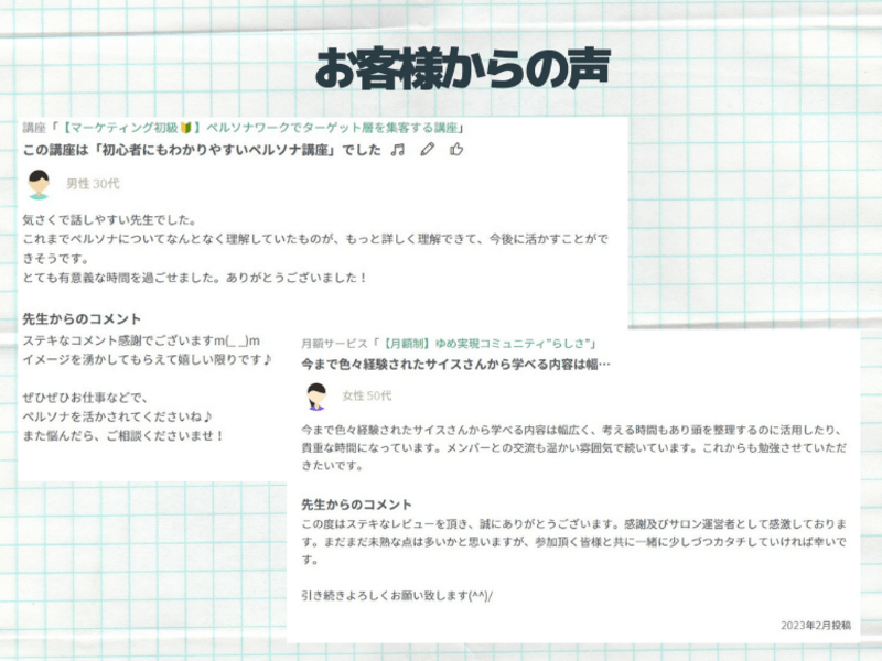 マーケティングの仕事をしていますが、いざペルソナやターゲットは?ということを決めないまま実務を進めていることがあり頭を整理するため受講しました。