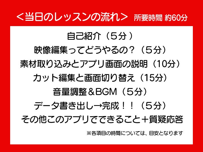 全く初めての動画編集講座(入門編)にドキドキで参加しましたが、オンラインでも、先生と一緒に体験することができ、丁寧な説明と分かりやすいアドバイスで、緊張する事なく、私にも基本の動画編集を完成することができ、感激しました。初心者の方にオススメの講座、先生です。