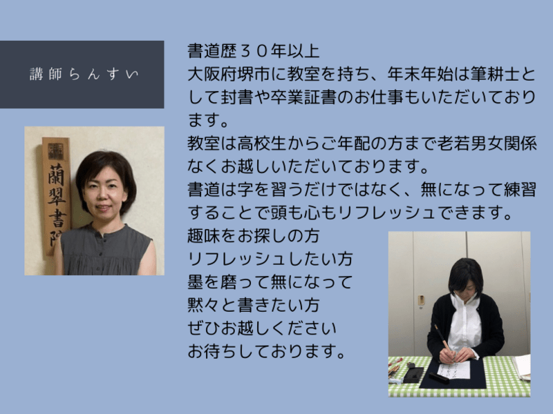 大阪府堺市で書道、ボールペンの教室の講師をしています。
