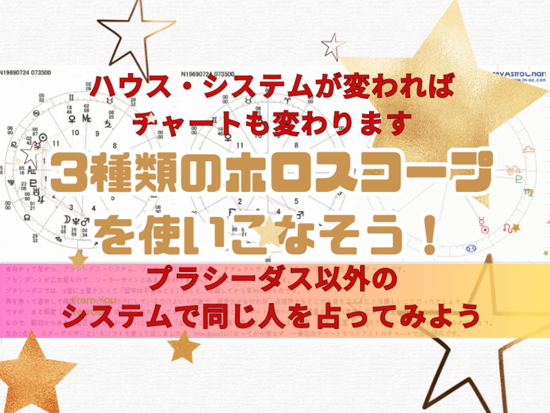 出生時間が分からないと、占えないと思い込んでいましたが、色々なホロスコープの作成方法があり、プラシーダスにこだわる必要がないことが分かり勉強になりました。