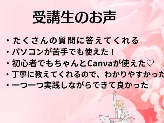 🌸仕事でPowerPointを使用することがあるのですが、あまり上手に使用できずに悩んでいたところ、ともちゃん先生の講座を受け、気持ちがとても楽になりました。Canvaの便利さがよくわかり、自分なりに色々挑戦したくなりました。ありがとうございました。