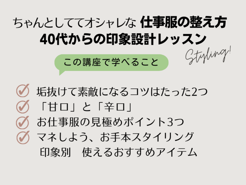 https://www.street-academy.com/myclass/171160また、靴やバッグなど小物まで整えることで印象はさらに安定します。