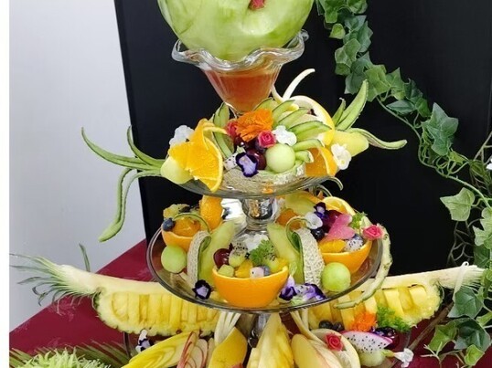 フルーツの3段盛り合わせを作ります。フルーツのすべての飾り切りを修得しましょう