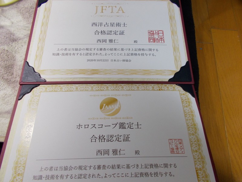 日本占い師協会(JFTA)及び日本メディカル心理セラピー協会(JAAMP)の【認定占い師】資格。