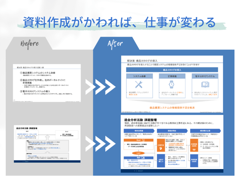 資料作成のスピードや質の向上のためには、正しい型の理解と実践の積み重ね、それに対する適切なフィードバックが重要です。
