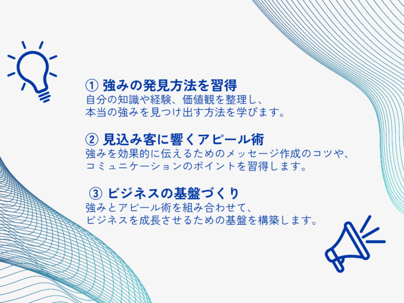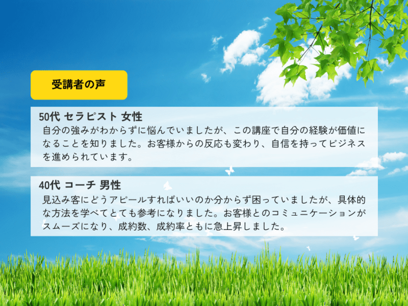 テーマはコンセプトメイキングではありましたが、それを超えて講師・コンサル型ビジネスの全体像を惜しみなく、かつ分かりやすく教えて下ったので、より理解が深まりました。具体と抽象をいったりきたりしながらの解説は分かりやすく、また資料もビジュアルで今後の参考になります。個別テーマだけでなく、ビジネス全体を把握されたい方に本当におススメの講座でした。ありがとうございました。