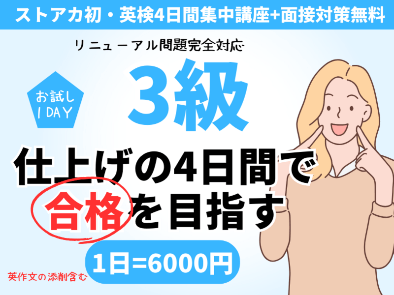 ※4日間の集中講座で、英検試験の各セクションについて徹底的に学習することができます。短期間で効率的な学習を行い、試験合格に向けて確実なスキルアップができます。