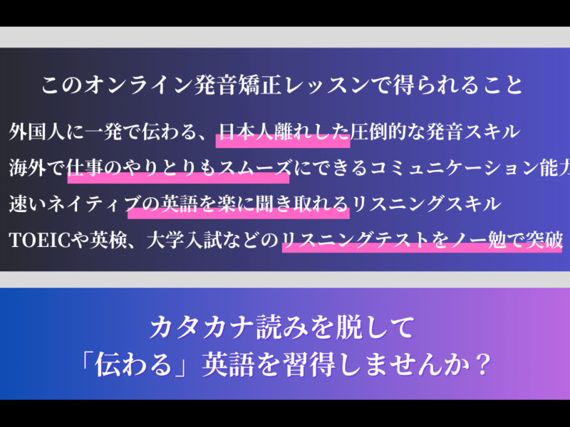 英語の発音に自信がなく、スピーキングやリスニングに課題を感じている方へ、誰でもできる簡単ステップで日本人離れした英語の発音を手に入れる方法を教えています。