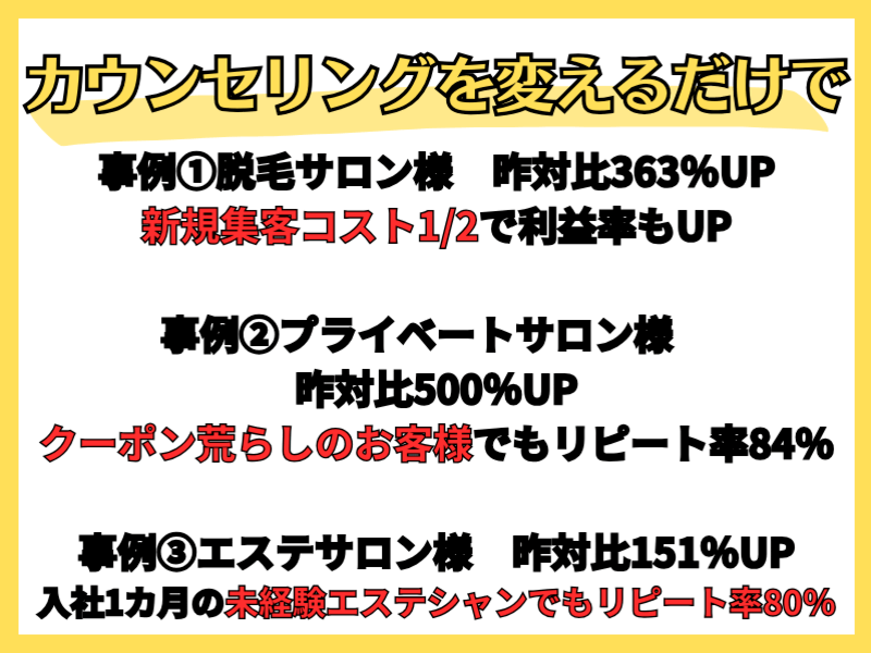 カウンセリング変更し、リピート率が向上し売上UP。