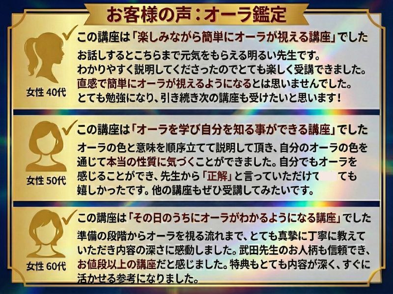 オーラを感じることができることがわかってとても楽しく発見がたくさんありました。