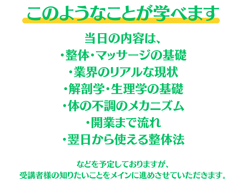 筋肉から関節、神経や内臓の働きなど、カラダを改善していくに必要な知識、スキルをお伝えします。