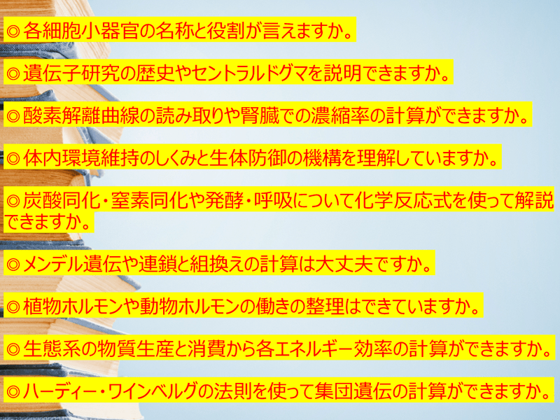 2回目からは通常の授業となり、各単元(①生物と遺伝子,②ヒトのからだの調節,③生物の多様性と生態系,④生物の進化と系統,➄生命現象と物質,⑥遺伝情報の発現と発生,⑦生物の環境応答,⑧生態と環境)の各項目をご希望に添って順次進めていきます〈宿題あり〉。