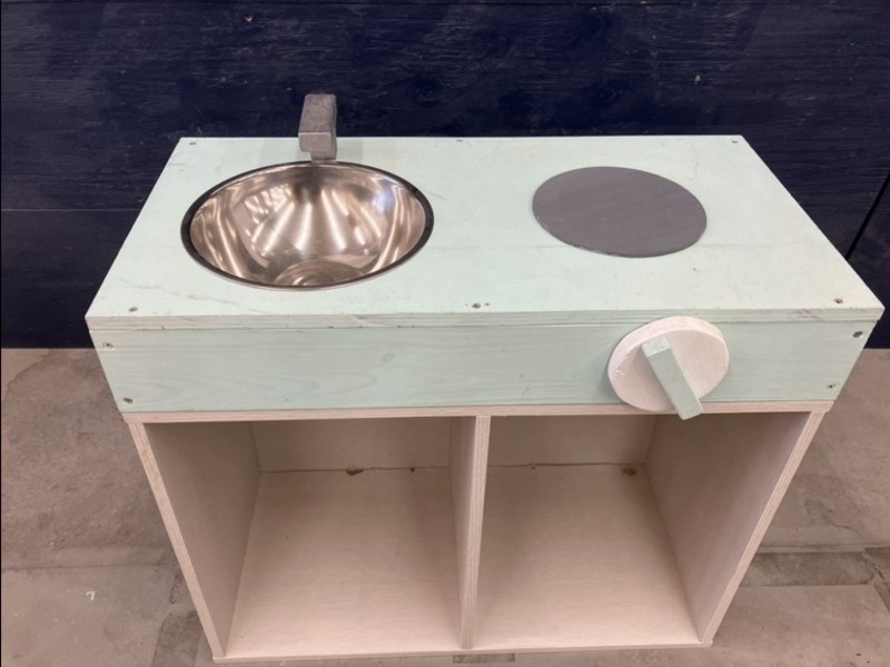 カラーボックスの上に、コンロとシンクを取り付けたかわいいおままごとキッチンです。