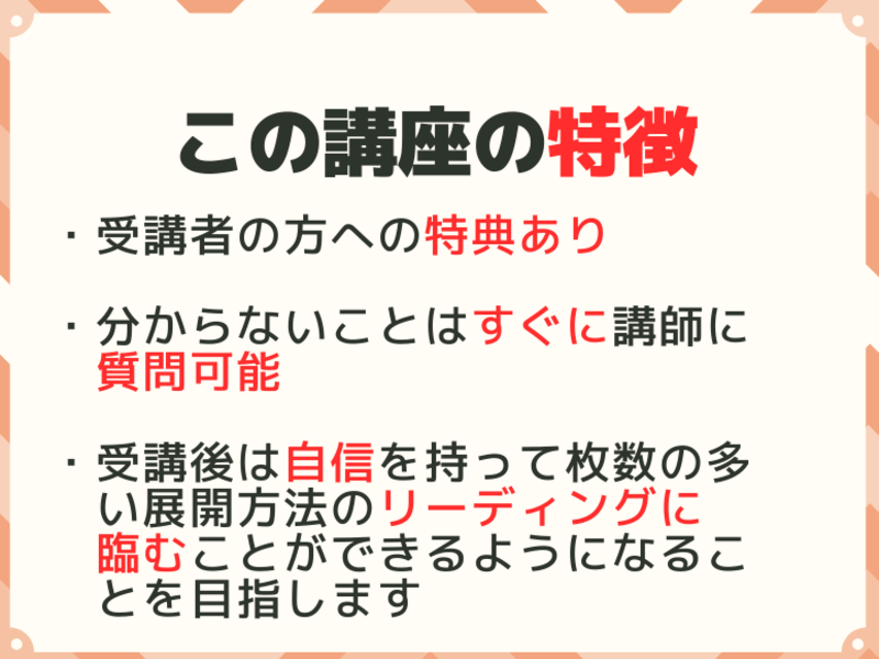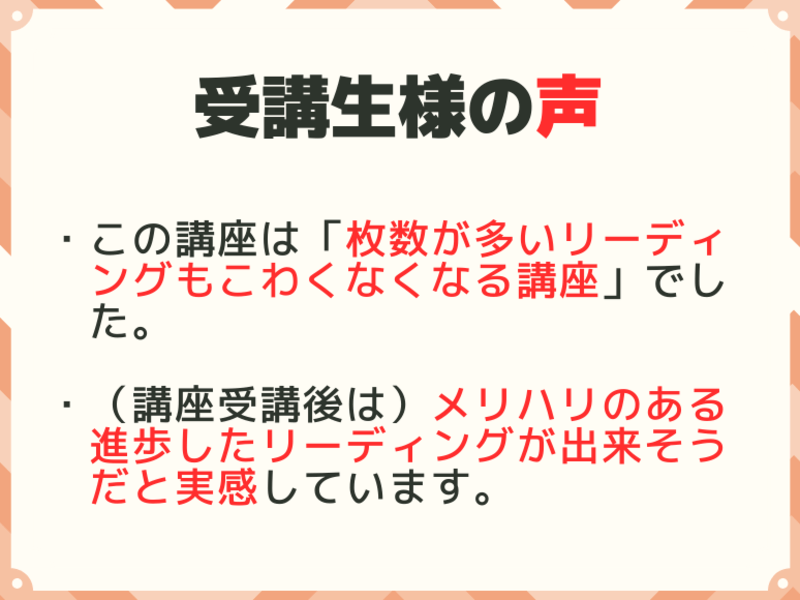 タロットリーディングができたらいいなと思いながら読み方が今一つ分からなかった超初心者でしたが、読むとき着目する点やそもそものカードリーディングの考え方に触れることができ、新たな目線でリーディングを知ることができました。先生の講義は優しく分かりやすくてリラックスできました。短い時間でしたが濃い学びがありました。ありがとうございました。