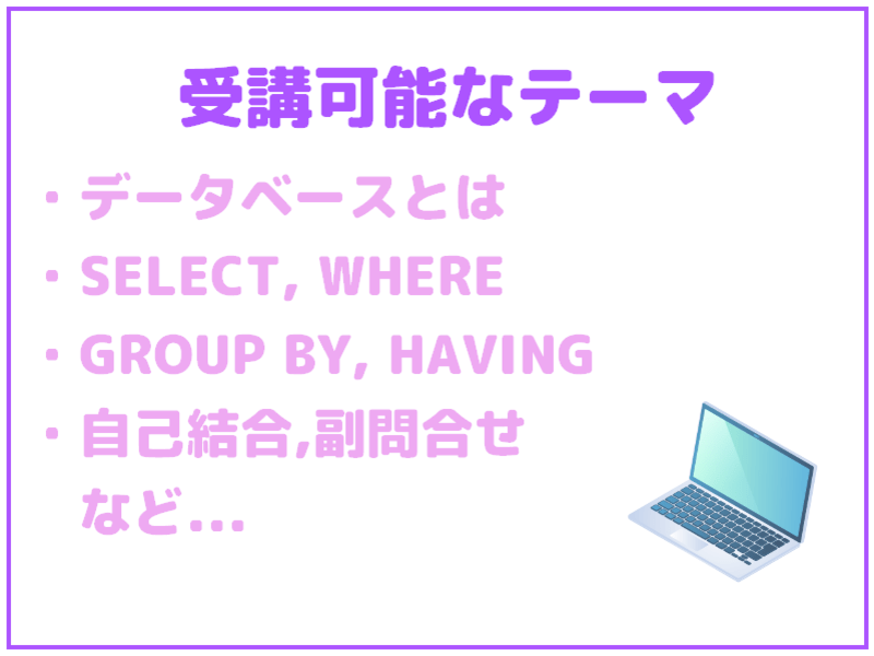 ・受講後もSQL学習を継続できる基礎力が身につきます。