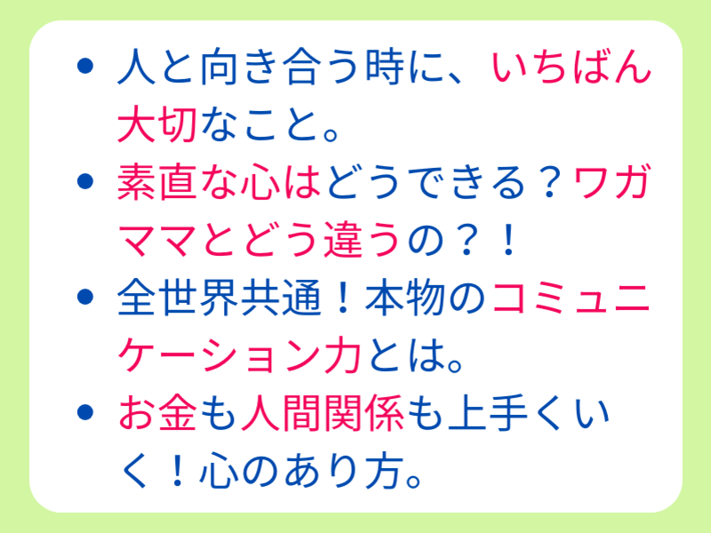 講師と話すことで自分の考え方の癖、問題となっている要素をに気付くことができました。自分を見つめなおし、変えるよいチャンスになりました。自分が変わると、周りも変わる。そのことに気が付くことができる講座でした。