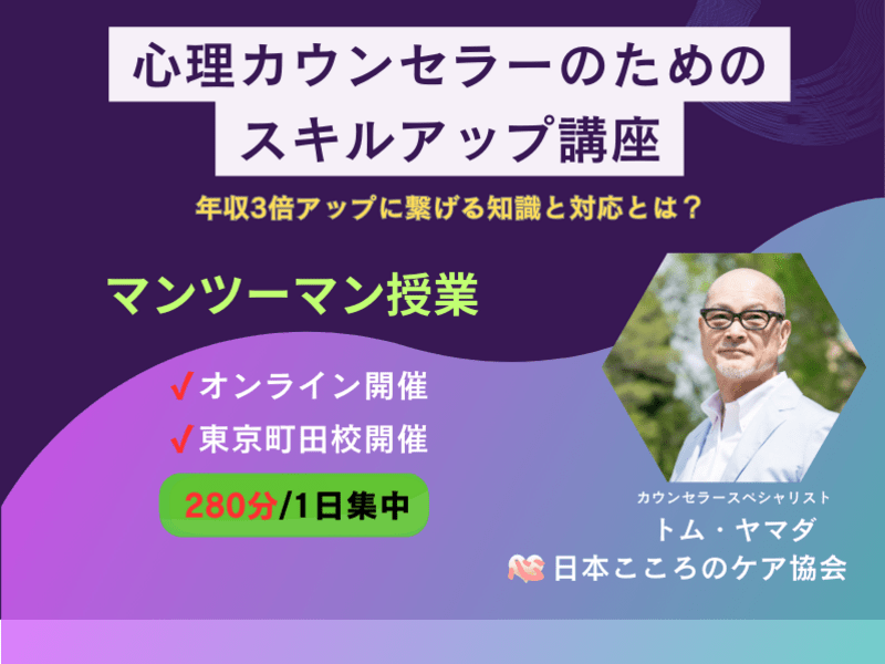 東京町田市で「日本こころのケア協会」の代表、心理カウンセラー、メンタルコーチ、積極的傾聴塾およびその他の心理療法の講座を開催しておりますトム山田と申します。