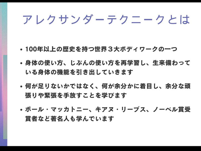 ◆アレクサンダーテクニーク教師の資格はアメリカで取得し、日本国内だけでなく、アメリカやヨーロッパでの指導経験あり。