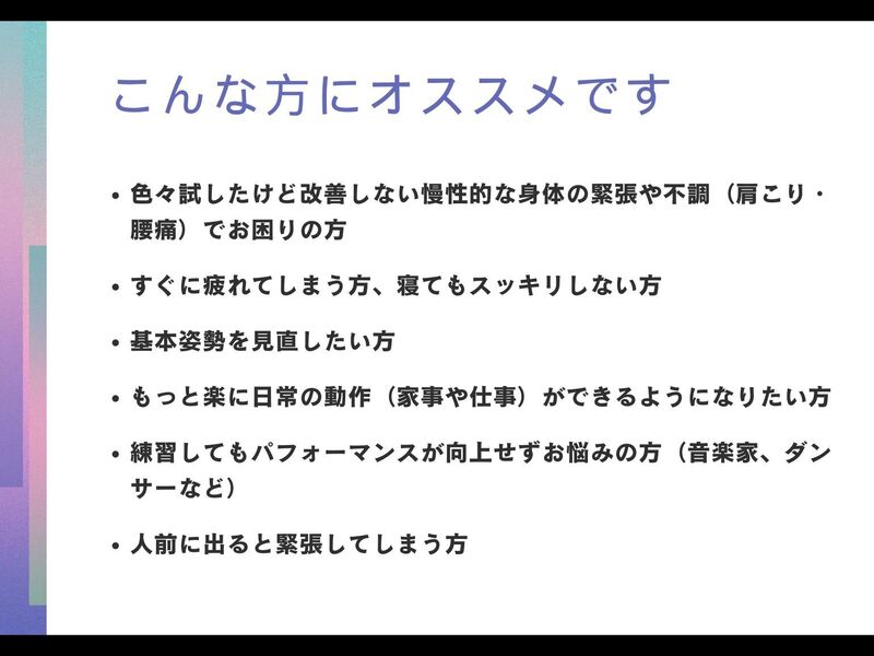◆心身に不調を抱えた人、音楽家やダンサーなどパフォーマンスを向上したい人など幅広く指導。