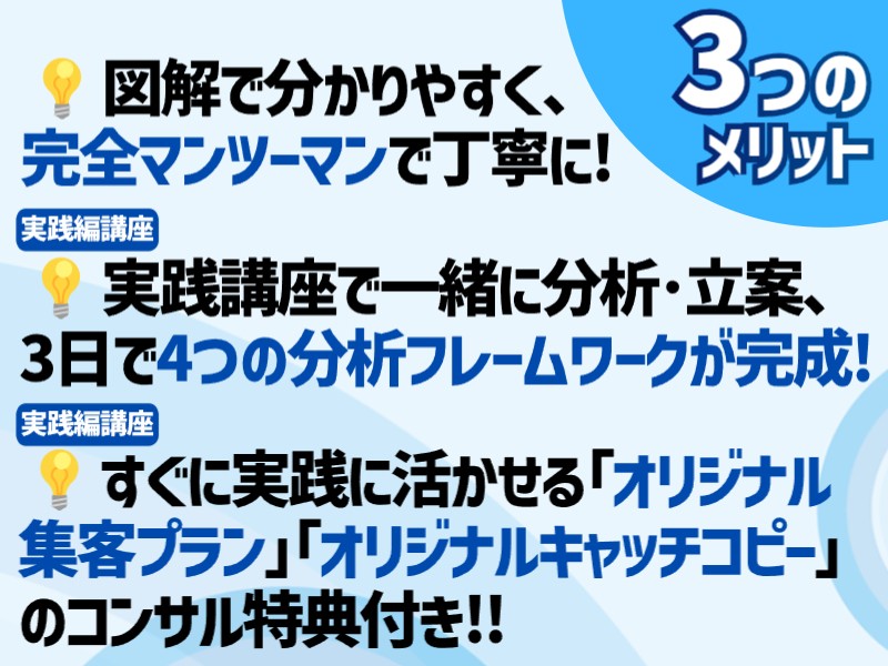 マーケッティングのことがわからずに受講いたしました。3回の講座でマーケティングの全体像、何をすれば良いのかがよくわかりました。この講座を受けるのと受けないのでは全然これからの制約が違ってくると思います。マーケティングを学んだことのない人においては、ぜひ受けておいて方が良い講座だと思います。3回の講座ほんとにありがとうございました。