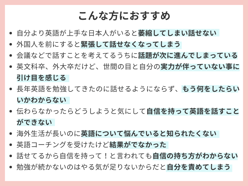 カナダ在住中に、カナダ在住3年目の日本人の方が、英語が話せないのを目の当たりにし、海外に住んだからといって英語が話せるようになるわけではないと思い知り、現地の人に話しかけまくる、バイト先は日本人のいないところへ応募しまくるなど、悪戦苦闘しながら英語を習得。