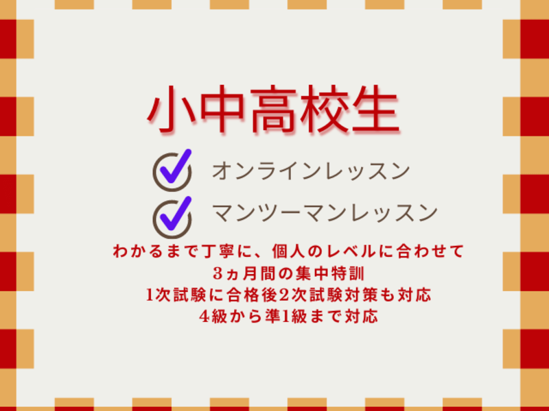 30年ぶりに、漠然と10月に英検を受けたいと思い、受講させて頂きました。ライティングの対策も必要なのかと驚いています。私のレベルに合わせて下さり、じっくりとご指導頂きました。