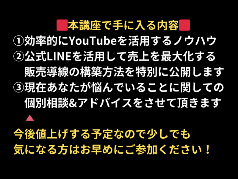 SNS全ての中でなんでYouTubeが売上に繋がるのかを教えていただきました。講座内容はもちろんですが、私の状況に合わせて具体的なアドバイスをくださったので大変ありがたかったです。今後もよろしくお願いいたします。
