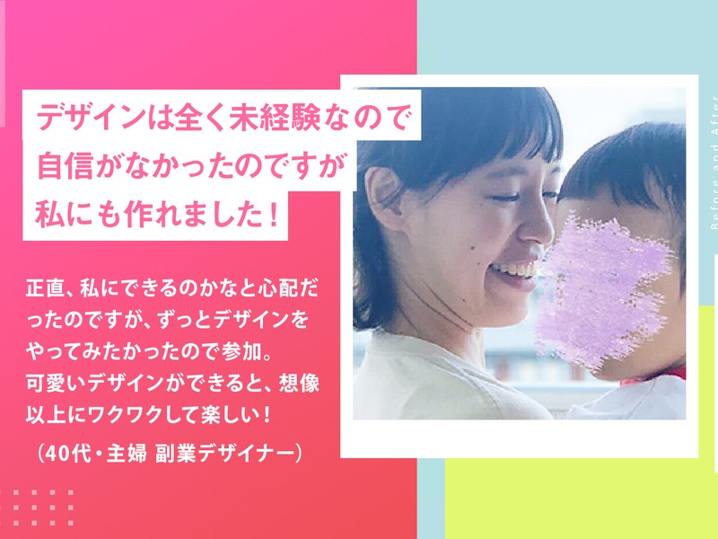 デザインに正解はありません。優しくもしっかりと上達できる環境で、趣味や実務において、1人で作れるようになるためのデザインスキルを身に着けられます。