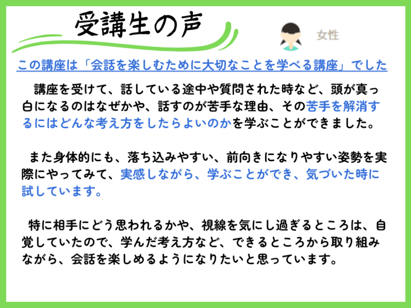 大勢の前で話すことに苦手意識があり、自分の番になると震えてしまうことが悩みでこちらの講座を受講しました。