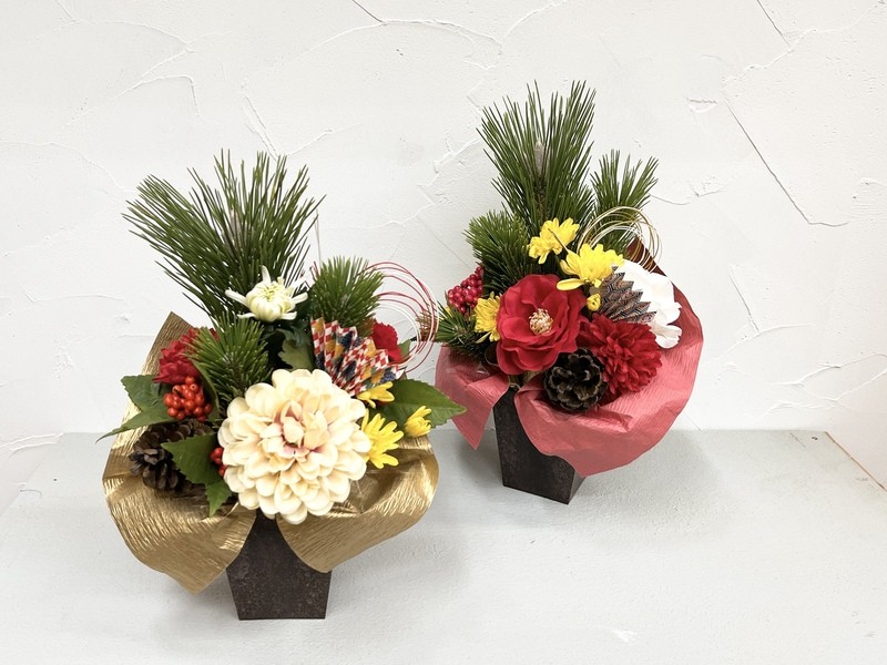 生の松、生花と造花を組み合わせてお正月のアレンジメントを作ります。配置のコツなど、フラワーアレンジメントの基本が分かります。