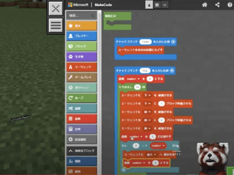 今回は、MakeCodeを使って、エージェントをつかって、階段の応用をしてみよう。途中で動画をとめて、自分で考えてみよう。