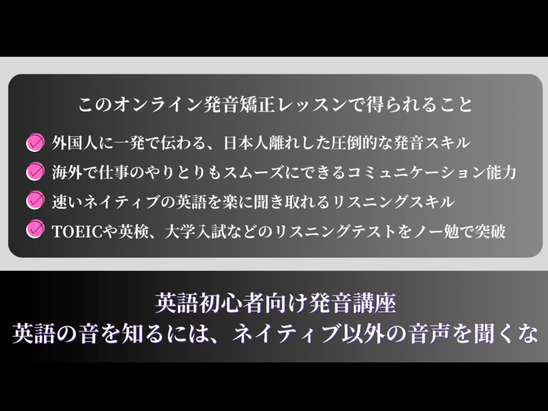 英語の発音に自信がなく、スピーキングやリスニングに課題を感じている方へ、誰でもできる簡単ステップで日本人離れした英語の発音を手に入れる方法を教えています。