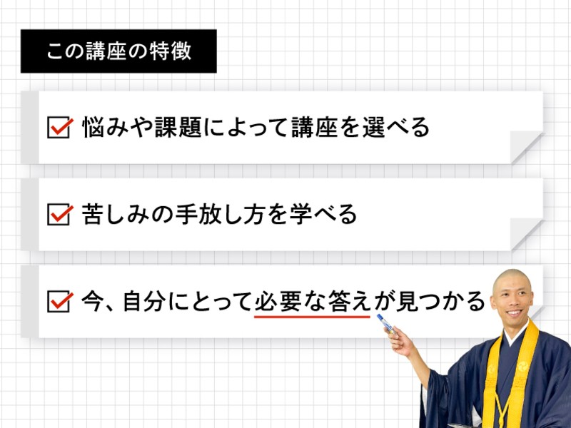 正適住職がこれまで数多くのご相談に乗ってきた経験から、それぞれの悩みに沿った単発講座(60分9,900円)をご用意しました。