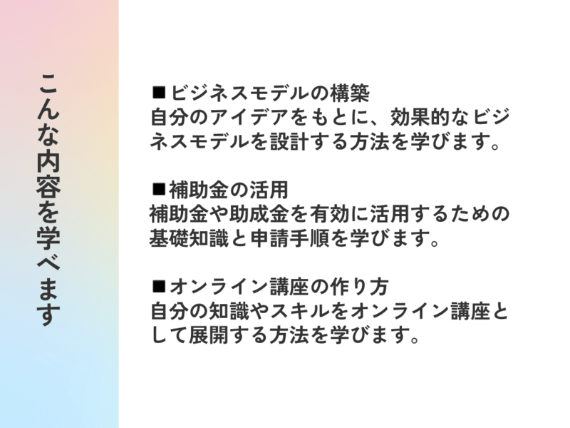 知識やスキルを活かし、オンライン講座として収益化するための手法を学びます。