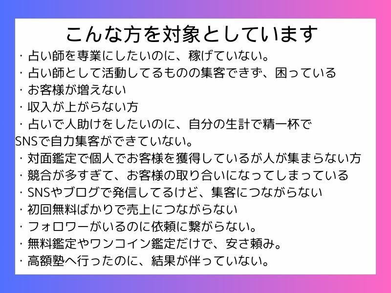 占い未経験者でも、最短9日間で占いのスキルを習得し、毎月30万円の売上を安定して獲得できる方法をお伝えします。私はSNSを活用して、集客や売上の安定を実現しました。