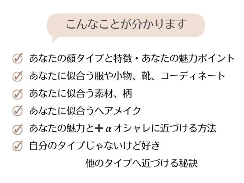 自分の顔や似合うものを資料を使いながらしっかりと説明いただいて、なるほど!と思うことや、これで間違ってなかった!と自信を持てることが詰まっていて、とても勉強になる講座でした!