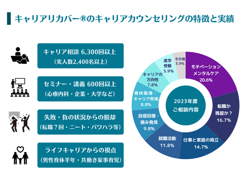 ◆企業、医療機関(心療内科)、大学などで、キャリア相談2,500名(約6,600回)以上