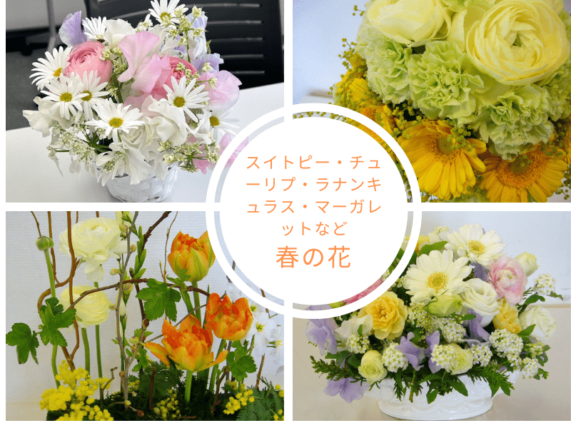 スィートピー、ラナンキュラス、デンファレなどなど淡い色の春の花を使ってのウキウキする講座でした。