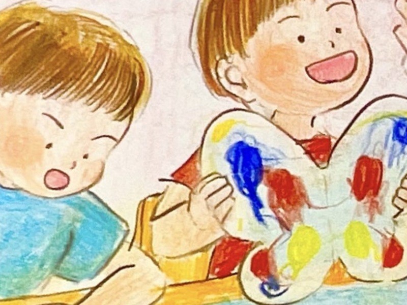 座ったり屈んだりするポーズの描き方や、保育室の背景の描き方、小道具の描き方や物を持つ仕草の描き方を習得します。
