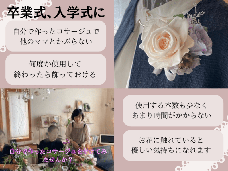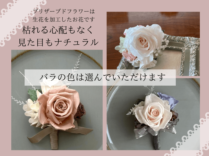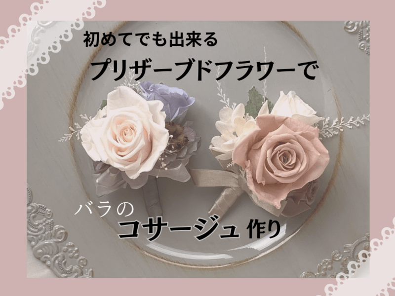 初心者でも美しいプリザーブドフラワーで作られたコサージュが作れます。バラ3輪を使用。色味はリクエスト可能。使用後はお部屋のインテリアにも♪