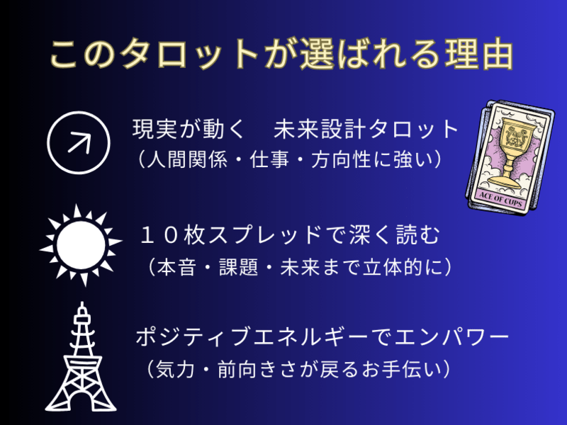 あなたの“本当の答え”を、10枚のカードで立体的に読み解きます。恋愛/仕事/人生の方向性に迷っている方へ。