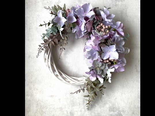 薄紫色の爽やかなアーティフィシャルフラワーリース、白い壁に特に映えます。 紫陽花は梅雨の季節だけではなく、通年楽しんでいただけるものです♡
