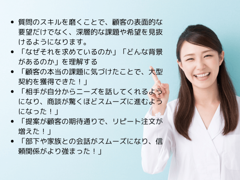 質問の質を高めたいビジネスパーソン、特に基本に立ち返りたい営業職のかたには、大変おすすめできる内容です。
