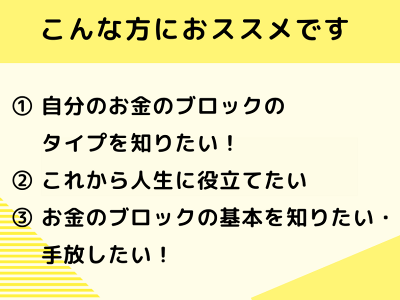 お金のブロックがどこにあるのかグラフでわかりやすく説明して下さり、意識することでとても気付きがありました。