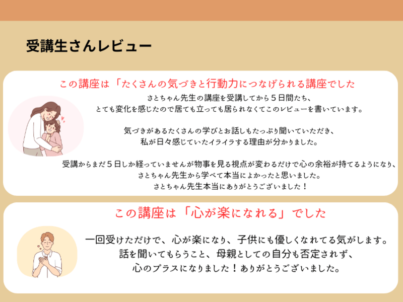 実体験をお話しくださったり、娘と重なる部分がありとてもわかりやすかったです。一人っ子でなんでも私の手や口が先にでてしまい、子供がやりやすい環境を整え行動を促すことも大切だと教えて頂きました。