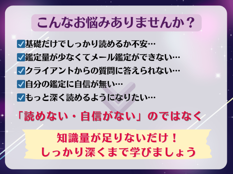 内容も基礎編と同様に大変整理されており、豊富な事例解説や、相談者の具体的な悩みに寄り添う鑑定ができるようになるのではと思います。また、基礎編までに「点」で理解していた知識が繋がり、運気の流れまで読めるようになったのは大きな収穫です。ありがとうございました。